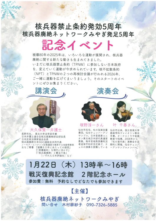 1/22(木)核兵器禁止条約発効5周年 記念イベント 投稿日時: 2025年12月26日 投稿者: miyagiadmin核兵器禁止条約発効5周年 核兵器廃絶ネットワークみやぎ発足5周年 記念イベント日時1月22日(木)13:30~16:00場所 仙台市戦災復興記念館 2階ホール参加費 無料主催 核兵器廃絶ネットワークみやぎ 木村緋紗子 090-7326-5885