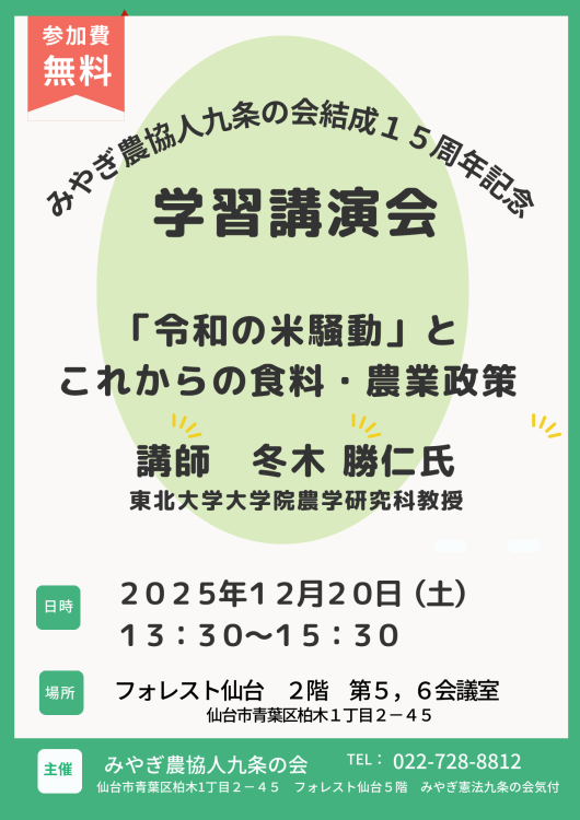 12/20(土) 農協人九条の会 講演「令和の米騒動」とこれからの食料・農業政策 投稿日時: 2025年12月15日 投稿者: miyagiadminみやぎ農協人九条の会は結成して15年になります。記念して学習講演会を開催します。ぜひご参加ください。