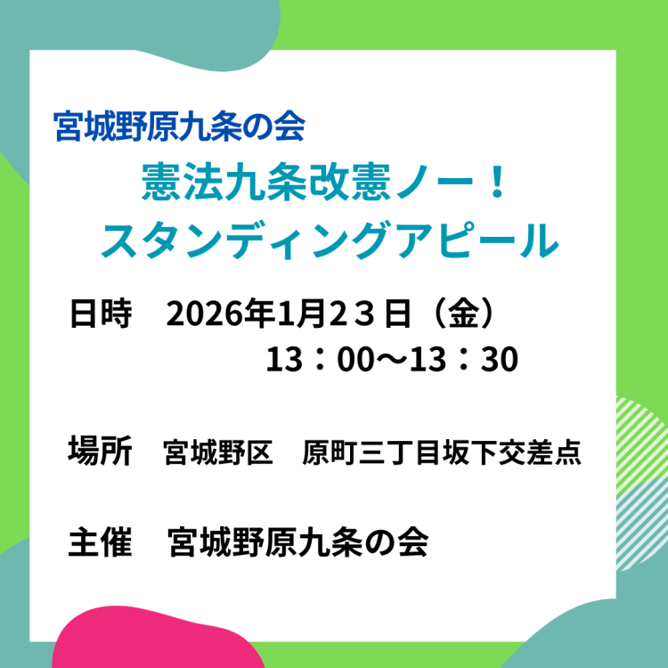 19日行動 ~9条に違反する「安保法制を強行採決」したことを忘れない~ 投稿日時: 2025年12月15日 投稿者: miyagiadmin19日行動は 2015年9月19日に9条に違反する「安保法制を強行採決」したことを忘れず、「安保法制廃棄」を求めて毎月おこなっている取り組みです。仙台市内は 中央通東二番丁交差点(平和ビル前)のほか、石巻市 涌谷町 美里町小牛田 気仙沼市 名取市 岩沼市など仙南九条の会は仙南地域の九条の会として みやぎ生協大河原店で開催します。詳しい場所、時間帯はホームページをご覧ください。