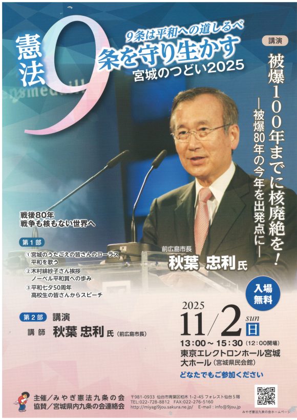 - 11/2((日)) 憲法9条を守り生かす宮城のつどい2025 前広島市長 秋葉忠利氏